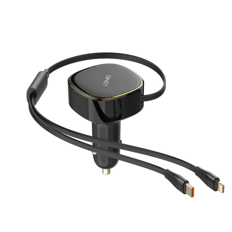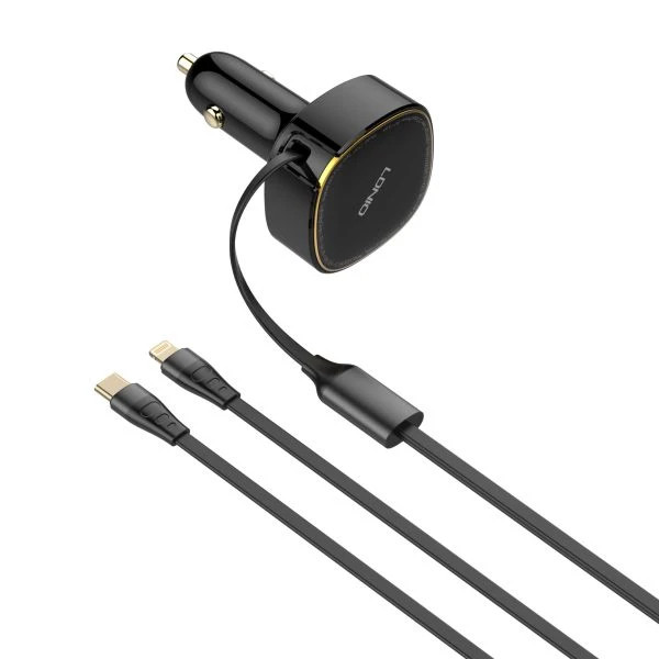 LDNIO C107 30W Fast Car Charger with Retractable Type‑C & Lightning Cable