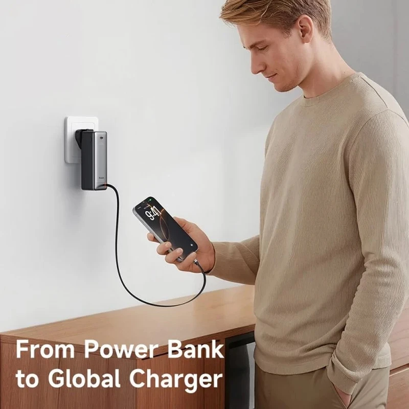 این پاوربانک ۱۰۰۰۰ میلیآمپرساعتی با توان ۳۰ وات شارژ سریع (PD ۳۰W)، دارای کابل جمعشونده داخلی USB-C (Retractable Cable)، نمایشگر دیجیتال LED برای نشان دادن درصد شارژ باقیمانده، و سرپیچهای قابل تعویض برق دیواری (UK / EU / US) است. یعنی هم به عنوان پاوربانک قابل حمل استفاده میشود، هم مستقیم به پریز دیواری وصل شده و به عنوان شارژر سریع ۳۰ وات عمل میکند. ایدهآل برای مسافرتهای خارجی، شارژ سریع گوشی، تبلت و حتی لپتاپهای کممصرف بدون نیاز به کابل اضافی.
